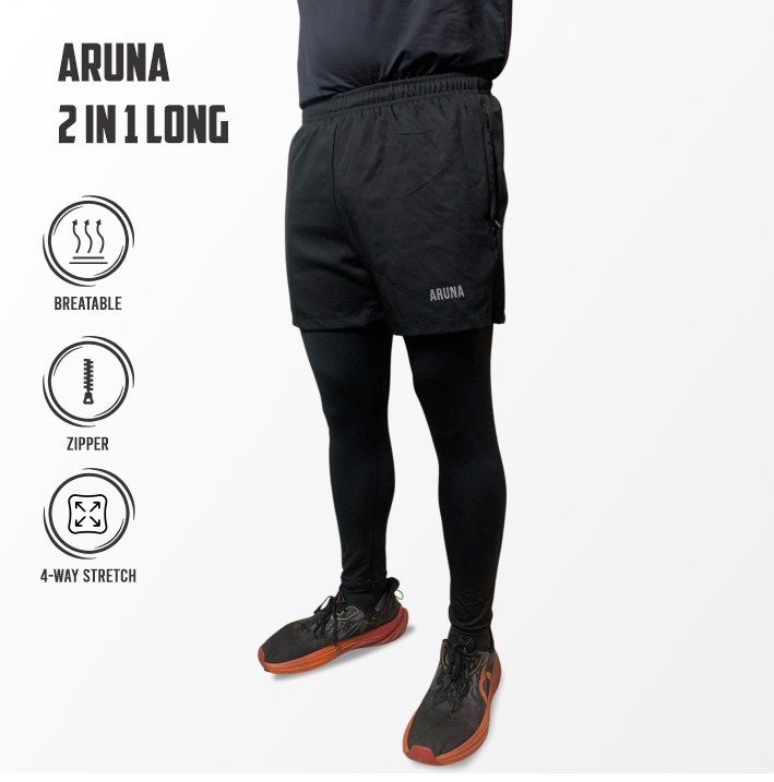Aruna 2 in 1 Long adalah celana olahraga dua lapis yang menggabungkan kenyamanan dan fungsi maksimal. Lapisan luar berbahan ringan dan cepat kering, sementara inner dapat menutupi / melindungi bagian paha hingga mata kaki. Dilengkapi saku resleting, tali pengencang, dan desain fleksibel yang cocok untuk lari, gym, maupun aktivitas outdoor.